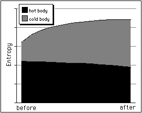A closer look at the entropy changes reveals that entropy must decrease less in the hot body than it increases in the cold. Note that absolute temperature change in both blocks are equal. It follows that the same amount of heat added to a hot body increases its entropy less than when added to a cold body - everything else being held constant.